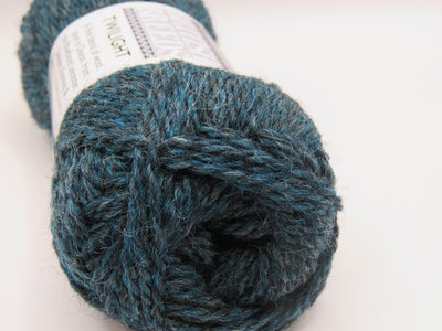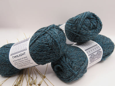Twilight is a rich, atmospheric blue-green inspired by fading evening light and deep coastal waters. Being the deepest of the teal tones, this shade has a moody depth that feels both dramatic and grounded. Subtle variations within the wool fibres give Twilight a softly heathered, almost stormy quality that adds beautiful dimension to knitted fabric.